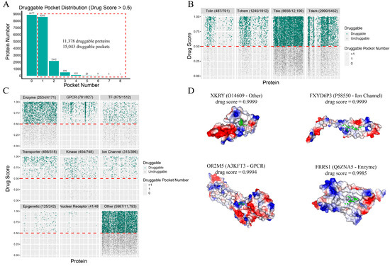 Druggability analysis of human proteome. (A) Bar chart of druggable pockets and druggable protein quantities in the human proteome predicted using Fpocket; 15,043 druggable pockets and 11,378 druggable proteins were identified. (B) Druggability in the human proteome at the target development level. The predicted fraction of druggable proteins exceeded 50% in each of the categories. Proteins above the red dashed line are druggable proteins. (C) Druggability in the human proteome at the family level. Proteins above the red dashed line are druggable proteins. (D) Examples of pockets of Tdark proteins with the highest drug scores from different families; green circles represent pocket (not a specific ligand). Name, family, and drug score of each protein are provided above the structure.