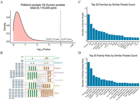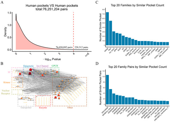 A total of 15,043 pockets with a drug score greater than 0.5 were initially identified in the human proteome. We filtered and retained 12,350 eligible pockets considering the requirement of at least 10 amino acid residues for Apoc [23] analysis. Apoc was then applied to pairwise-compare these pockets, excluding intraprotein pairs, which resulted in 76,251,204 pocket pairs, of which 220,312 pairs showed significant similarity (p-value < 0.0001) (Figure 3A). The results are visualized in a network graph (Figure S3). We screened for 3241 pairs of similar pocket pairs that exist between proteins in different families and with different domains, so these pockets may have greater potential importance in drug repurposing.
