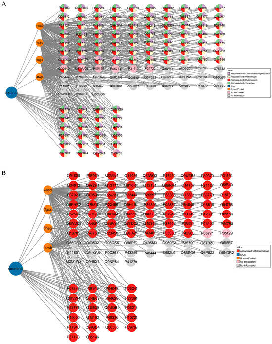 The analysis of sorafenib yielded similar results. As shown in Table 1, sorafenib has 130 known targets and 4 known pockets. Sorafenib was repositioned to 107 targets, with 22 overlaps with known targets. Of the 68 documented side effects of sorafenib, 60 are associated with these newly predicted targets, particularly the serious side effect of skin disease. Of the 85 new potential targets identified, 63 have associated side effects and 61 are related to adverse skin disease effects. The association network for sorafenib is shown in Figure 6B, and Table S3 indicates that all 63 newly identified targets with side effect information are linked to novel side effects, shedding light on the side effects of sorafenib.