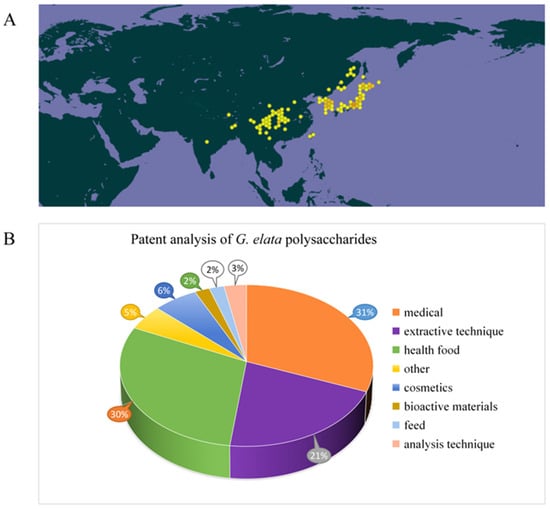 The distribution of G. elata in the world (https://www.gbif.org/) (accessed on 15 October 2024.) (A) and analysis of related patents on G. elata polysaccharides (B).