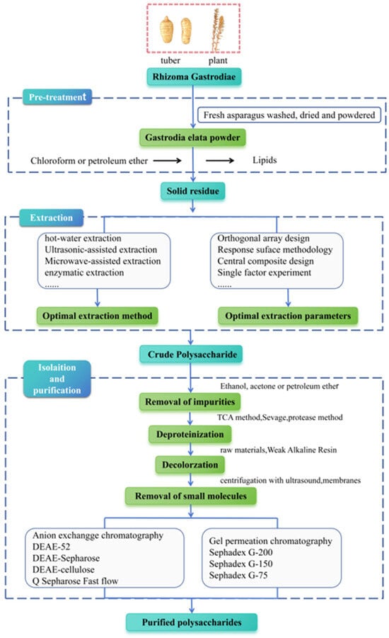Extracting plant polysaccharides is crucial for subsequent purifying processes, structural analysis, and investigation on pharmacological activities. Therefore, present optimizing extraction techniques for G. elata polysaccharides have become a primary research focus, with methods such as extracting by hot water, ultrasonic, microwave, and enzyme being commonly used [20,29]. The extraction and purification process is shown in Figure 2. Initially, organic solvents like chloroform and petroleum ether are utilized for degreasing to eliminate fat-soluble components, followed by specific extraction methods to extract polysaccharides from G. elata. Among them, the water extraction and alcohol precipitating method is the most extensively applied traditional extraction method for G. elata polysaccharide research [14,24,30,31]. The polarity of polysaccharides is high, and most types of polysaccharides have a large and stable solubility in hot water, while their solubility in organic solvents is small; therefore, hot water is generally applied as an extraction solvent. Moreover, the penetration of hot water into plant tissue is relatively strong, which can improve the extraction efficiency, making it more economical and safer to be used in production. However, this method is cumbersome to operate, and extraction by hot water at high temperature brings polysaccharide degradation, resulting in a relatively low extraction rate.
