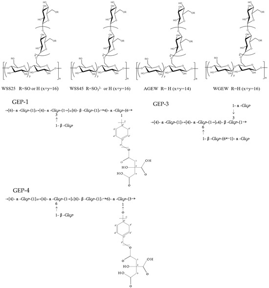 Polysaccharide structure of WSS25, WSS45, AGEW, WGEW, CEP-4, GEP-3, and CEP-1.