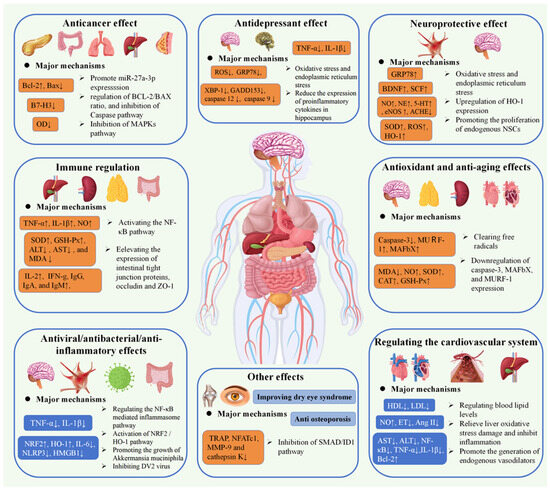 Schematic representation for the bioactivities of G. elata polysaccharides (↑: It indicates that receptors, hormones, proteins, etc. are up-regulated or increased. ↓: It indicates that receptors, hormones, proteins, etc. are down-regulated or reduction).