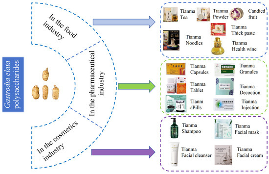 G. elata polysaccharides are mainly used in the fields of pharmaceuticals, health foods, and cosmetics, as shown in Figure 5.