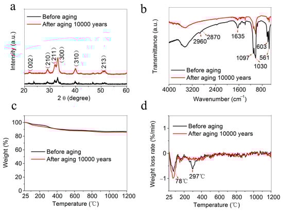 Characterization of the fire-resistant “Xuan paper” based on ultralong HAP nanowires before and after the continuous accelerated heat aging for 1200 days, which is equivalent to 10,000 years of natural aging in the ambient environment: (a) XRD patterns; (b) Fourier-transform infrared (FTIR) spectra; (c) thermogravimetric (TG) curves; and (d) the derivate thermogravimetric (DTG) curves.