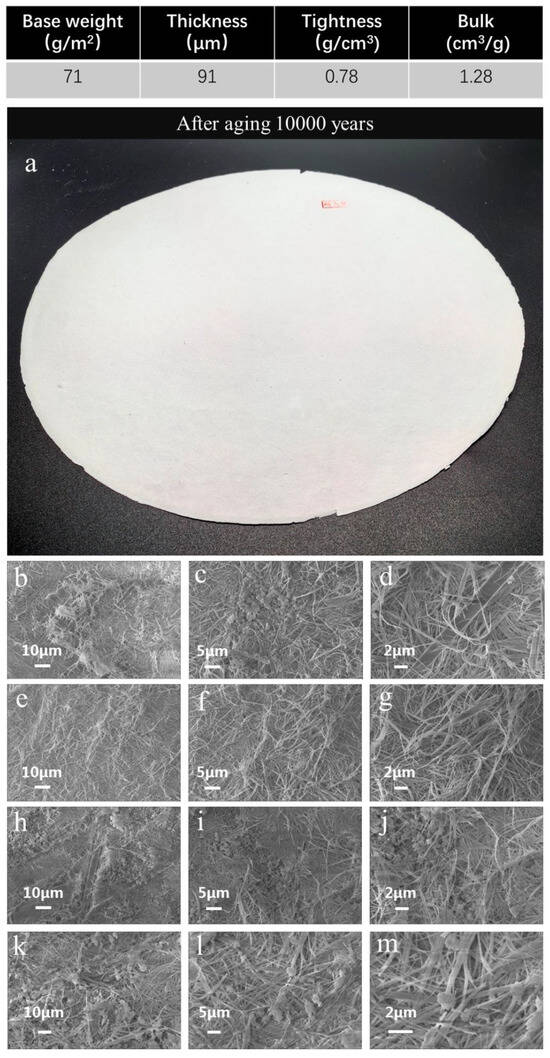 Characterization of the fire-resistant “Xuan paper” based on ultralong HAP nanowires after the continuous accelerated heat aging for 1200 days: (a) a digital image showing the appearance of the fire-resistant “Xuan paper” after the continuous accelerated heat aging for 1200 days; (b–g) SEM images of the top surface (b–d) and the bottom surface (e–g) of the fire-resistant “Xuan paper” without the accelerated heat aging; and (h–m) SEM images of the top surface (h–j) and the bottom surface (k–m) of the fire-resistant “Xuan paper” after the continuous accelerated heat aging for 1200 days.