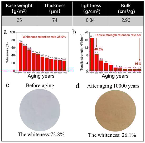 The performance evaluation of the traditional Chinese Xuan paper based on cellulose fibers before and after the continuous accelerated heat aging for up to 1200 days: (a) whiteness versus aging time of the traditional Xuan paper; (b) tensile strength versus aging time of the traditional Xuan paper; and (c,d) digital images of the traditional Xuan paper before (c) and after (d) the continuous accelerated heat aging for 1200 days.