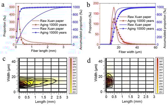 Characterization of cellulose fiber length distribution and fiber width distribution of the traditional Chinese Xuan paper before and after the continuous accelerated heat aging for 1200 days: (a) fiber length distribution curves; (b) fiber width distribution curves; and (c,d) width–length distributions of the traditional Chinese Xuan paper before (c) and after (d) the continuous accelerated heat aging for 1200 days.