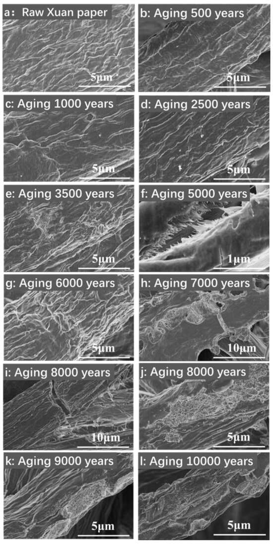 Figure 5a shows a SEM image of the traditional Chinese Xuan paper before the accelerated heat aging. When the continuous accelerated heat aging time is less than 2500 years of natural aging, significant changes in the morphology of cellulose fibers in the traditional Xuan paper are not observed (Figure 5b–d). However, when the continuous accelerated heat aging time is equivalent to 3500 years of natural aging, the obvious fragmentation phenomenon of cellulose fibers on the surface of the traditional Xuan paper appears (Figure 5e). When the continuous accelerated heat aging time is equivalent to 5000 years of natural aging, large-sized tearing gaps appear on the surface of the traditional Xuan paper (Figure 5f). When the continuous accelerated heat aging times are equivalent to 6000~8000 years of natural aging, severe damages such as cracks, holes, broken fibers, and fragmentation are observed on the surface of the traditional Xuan paper, as shown in Figure 5g–j.