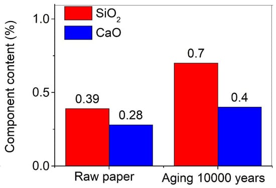 The traditional Xuan paper has good durability, which is attributed to its unique building materials and handmade manufacturing process, including more than 100 steps. The traditional Xuan paper is mainly made of the bark of Pteroceltis tatarinowii, a kind of cellulose fiber, which is an organic compound with the formula (C6H10O5)n, a kind of polysaccharide consisting of a linear chain of several hundred to thousands of β(1–4)-linked D-glucose units. Pteroceltis tatarinowii is produced in Jing County, Anhui Province, China. The local geological limestone leads to the deposition of a layer of limestone particles on the bark of Pteroceltis tatarinowii, which can neutralize acidic compounds produced by cellulose hydrolysis and acids from the environment. This is one of the important reasons for the good durability of the traditional Xuan paper. The components of SiO2 (0.39 wt.%) and CaO (0.28 wt.%) are detected, in addition to the main elements of C, H, and O in the traditional Chinese Xuan paper (Figure 6). However, after a long period of the accelerated heat aging for 1200 days, equivalent to 10,000 years of natural aging, the contents of SiO2 and CaO increase to 0.70 wt.% and 0.40 wt.%, respectively. Although the traditional Chinese Xuan paper is the most durable paper, the structure and properties of the traditional Chinese Xuan paper still deteriorate significantly with the extension of the aging time.