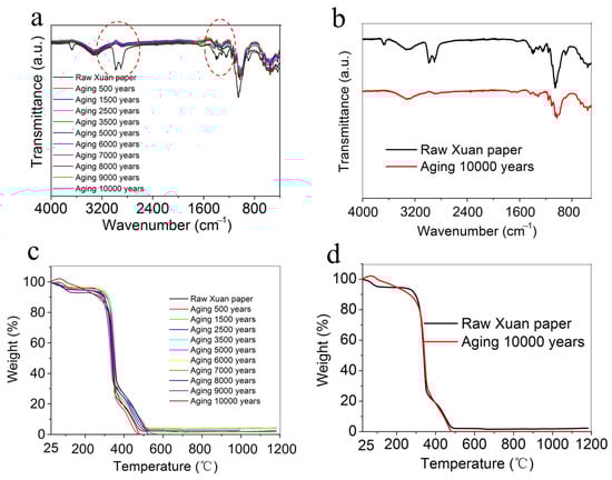 FTIR spectra (a,b) and TG curves (c,d) of the traditional Chinese Xuan paper before and after the continuous accelerated heat aging for different times.