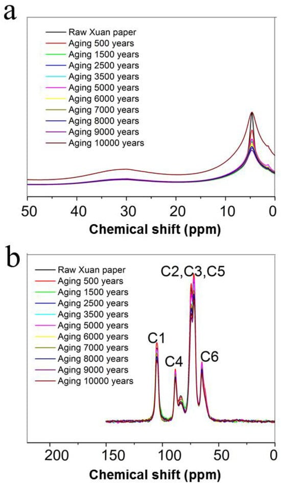 H–Nuclear magnetic resonance spectra (a) and C–nuclear magnetic resonance spectra (b) of the traditional Chinese Xuan paper before and after the continuous accelerated heat aging for different times.