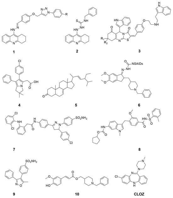 AD is a multifactorial disease, i.e., under diseased conditions, several molecular targets are either upregulated or downregulated [5]. In this context, several reports were published that displayed multi-target action for improvement of AD. For example, Al-Fadly et al. reported Tetrahydroacridine-triazole (1, Figure 1) and thiosemicarbazide (2) hybrids as COX-2, 15-Lipooxygenase (LOX) hBChE, and hAChE inhibitors to serve as multi-target directed ligands for AD treatment [6]. Javed et al. performed structural modifications on pyrimidine and pyrrolidone cores for the inhibition of COX-2, 5-LOX, BChE, and AChE [7]. Nadeem et al. reported indole derivatives carrying 2-arylidene derivatives of thiazolopyrimidine (3) as multitarget inhibitors of monoamine oxidase (MAO)-A, MOA-B, BChE, and AChE [8]. Martinez et al. evaluated terpenes from industrial orange juice by-products against the inhibition of LOX, BChE, and AChE for AD [9]. Razavi et al. reviewed the potential of licofelone (4, an NSAID) for the treatment of neurological disorders including AD. It is relevant to mention that licofelone is an established COX and LOX inhibitor [10]. Alqahtani et al. extracted stigmasta-7,22-diene-3-one (5) from Isodon rugosus for the inhibition of COX, LOX, BuChE, and AChE [11]. Fang et al. reported donepezil coupled with conventional NSAIDs (6) for the inhibition of COX-1, COX-2, BuChE, and AChE [12]. Javed et al. reported diclofenac derivatives (7) as concomitant inhibitors of AChE, MAO, COX-2, and 5-LOX for the potential agents against AD [13]. Kalra et al. demonstrated that modulation of COX and LOX inflammatory pathways provides mitoprotection to AD rats using Zafirlukast (8) and valdecoxib (9) [14]. Dias et al. reported a hybrid of feruloyl-donepezil (10) as the multi-target inhibitory ligand for COX-1, COX-2, 5-LOX, and AChE [15]. Zhang et al., while reviewing the nine important strategies for improved treatment of AD, highlighted the importance of dual inhibition of COX and LOX [16]. Similarly, Cornec et al. reviewed multitargeted imidazoles as potential therapeutic leads for AD and other neurodegenerative diseases and outlined the importance of COX and LOX pathway modulation in improved AD treatment [17].