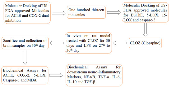 Clozapine (CLOZ) is an FDA-approved atypical tricyclic anti-psychotic molecule used for the treatment of schizophrenia. However, its use is limited due to the associated agranulocytosis and toxic hepatitis in a few cases. Because clozapine displays a promising therapeutic profile, it can be used as a template to develop new chemical entities devoid of agranulocytosis. Repurposing existing drugs, including those derived from chemically diverse natural products, presents a cost-effective and efficient strategy to address unmet medical needs. The inherent chemo-diversity of natural products, with their unique structural complexity and functional variability, serves as a valuable resource for identifying new therapeutic applications. Similarly, by leveraging the established pharmacodynamics and pharmacokinetics profile of known molecules, this approach can significantly accelerate the drug development pipeline [18,19]. In this work, structure-based virtual screening of US-FDA-approved molecules from the ZINC15 database identified CLOZ as a dual inhibitor of COX-2 and AChE. Further molecular docking was performed into the active sites of 5-LOX, 15-LOX, and Caspase-3. The binding potential of CLOZ against the above-mentioned proteins was also evaluated using molecular dynamics simulation (MDS), followed by biological evaluation using in vivo model. As AD is characterized by inflammation oxidative stress, clozapine was also evaluated for downstream inflammatory markers like NF-κB, TNF-α, IL-6, IL-10, and TGF-β1. To the best of our knowledge, the above-mentioned molecular targets are not very well documented for CLOZ. This study aims to provide additional evidence that COX-2, 5-LOX AChE, and Caspase-3 are molecular targets and can be modulated by the first atypical antipsychotic CLOZ discovered in the year 1958. Figure 2 shows the workflow taken up in this report.