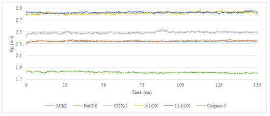 MDS is crucial for exploring the dynamic interactions within protein–inhibitor complexes, revealing stability, binding interactions, and conformational flexibility. Unlike static docking, MD captures how temperature, solvent, and pressure affect molecular movements over time. This approach provides detailed insights into transient interactions such as hydrogen bonds and hydrophobic contacts, which are essential for understanding protein inhibition and enhancing inhibitor design in drug discovery. Therefore, in this work, the CLOZ complexed with AChE, BuChE, COX-2, 5-LOX, 15-LOX, and Caspase-3 was considered for MDS to evaluate their stability and binding interaction under dynamical conditions.