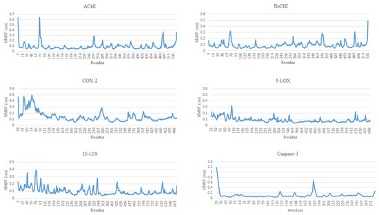 RMSF is a commonly used metric in molecular dynamics (MD) simulations to quantify the flexibility of individual residues within a protein. RMSF represents the average deviation of each residue or atom from its mean position over the course of the simulation, indicating the extent of fluctuations in different regions of the molecule. Higher RMSF values typically correspond to flexible regions, such as loops or surface-exposed areas, while lower values suggest more rigid, structurally stable regions, often in the protein’s core. RMSF analysis helps to pinpoint flexible and stable areas, providing insights into the protein’s structural dynamics and functional sites. The RMSF values for all proteins in consideration varied in the range of 0.2 to 0.5 nm. For AChE, the RMSF values showed significant fluctuations for residues at the N-terminal region, with the peak of residue 43 reaching 3.5 nm. Beyond residue 43, the RMSF value stabilized around 1 nm with minor fluctuations at the C terminal, indicating that the N-terminal of the AChE is highly flexible, with the rest of the protein being relatively stable. For BuChE, the RMSF values were lower and remained below 0.5 nm. Periodic spikes were observed, indicating the regions of flexibility, especially towards the C-terminal end of the protein. Overall, the BuChE displayed uniform stability, with minor fluctuations throughout the protein. For the complex of COX-2, the fluctuations were observed to be marginally higher at the N-terminal regions, with residues around 72 displaying values of 0.5 nm. Beyond residue 72, the RMSF values decreased to 0.2 nm, with peaks scattered across the protein suggesting that the N-terminal region of the COX-2 is marginally flexible while the rest of the protein is stable. For 5-LOX, the RMSF fluctuations for most of the residues stayed around 0.2 nm, with residue 133 displaying highest the RMSF value of 0.35 nm, in addition to the few minor peaks that were observed throughout the protein structure. Overall, the 5-LOX displayed general stability across the protein. The residues of 15-LOX displayed moderate fluctuations, with residues 22, 292, and 372 displaying the highest RMSF values of 0.4 nm. As observed for 5-LOX, most of the fluctuations were minor, suggesting stable regions with flexible areas in between. Overall, AChE displayed the highest flexibility among the proteins, particularly at the N-terminus, while COX-2, 5-LOX, and 15-LOX showed more moderate fluctuations. BuChE appeared to be the most stable, with fewer regions of high flexibility. Figure 5 shows the RMSFs for all complexes.