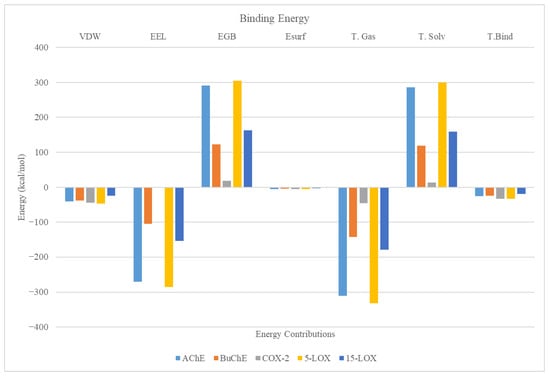 Binding energy is a critical parameter that quantifies the strength and stability of the complex formed between a receptor and its ligand. Figure 6 shows the binding energy calculated for the CLOZ complexed with the AChE, BuChE, COX-2, 5-LOX, and 15-LOX using the Generalized Born Surface Area (GBSA) approach, a popular method in MDS. The gas phase energy (∆E (gas)) includes contributions from Van der Waals (∆EVDW) and electrostatic energy (∆EEL) and represents energies from the direct interaction of protein and CLOZ in the absence of solvent. The solvent phase energy (∆Esolv) is split into polar solvation energy (∆EGB) and non-polar solvation energy (∆Esurf). ΔEBind represents the net binding energy, combining both gas-phase and solvent-phase energy to predict the overall favorability of the protein–CLOZ binding. It should be noted that the binding energies shown in this work do not include entropy contributions and, hence, represent the enthalpy contributions to binding free energy. The total binding energy of CLOZ for all complexes varied in the range of ~8 to ~32 kcal/mol, with COX-2 and 5-LOX displaying the highest binding energy of 32 kcal/mol. The binding energy of CLOZ for cholinesterase was found to be ~25 kcal/mol. The binding energy of CLOZ for Caspase-3 was the lowest, with a value of ~8 kcal/mol. The individual contributions to the binding energy were also calculated. The gas-phase VDW energies were negative across all the complexes, indicating favorable hydrophobic interactions. The gas-phase EEL values were strongly negative for all complexes except for COX-2 and Caspase-3, indicating significant electrostatic interactions across AChE, BuChE, 5-LOX, and 15-LOX. A high amount of polar solvation energy was noted across all the enzymes except COX-2 and Caspase-3, indicating significant resistance from the solvent molecules during the binding of CLOZ with AChE, BuChE, 5-LOX, and 15-LOX. The non-polar solvation energy was found to be marginally negative across all the complexes, indicating minor favorable contributions to the binding energy from solvation of the ligand. The gas-phase energy was found to be a highly favorable protein–ligand interaction. The solvent-phase energy was found to highly unfavorable, except for COX-2 and Caspase-3. Overall, the binding of CLOZ to AChE, BuChE, 5-LOX, and 15-LOX was driven by both by electrostatic and VDW despite a high amount of solvation penalties. The binding of CLOZ to COX-2 and Caspase-3 was mainly driven by hydrophobic interactions. Further, the CLOZ displayed the highest amount of binding energy for COX-2 and 5-LOX.