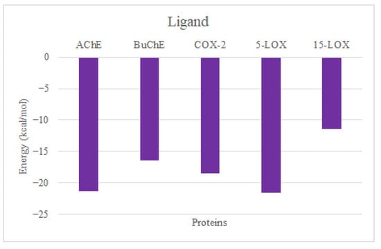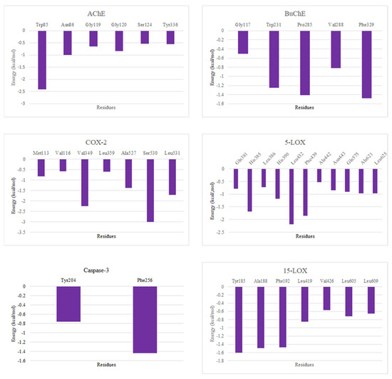 Figure 7 presents the per-residue energy decomposition analysis for the interactions of ligands with AChE, BuChE, COX-2, 5-LOX, and 15-LOX. The results indicate significant contributions from specific residues to the binding energy across all targets. For AChE, Trp85 exhibited the strongest interaction, contributing approximately −2.5 kcal/mol, while Asn86 and Gly120 provided moderate stabilization (~1.0 kcal/mol). In BuChE, Phe329, Pro285, and Trp231 were the major contributors, with energies around −1.6, −1.4, and −1.2 kcal/mol, respectively. For COX-2, Ser530 displayed the highest contribution at approximately −3.0 kcal/mol, followed by Val349 (−2.2 kcal/mol), Leu531 (−1.7 kcal/mol), and Ala527 (−1.4 kcal/mol). The interaction profile of 5-LOX showed notable contributions from residues His385, Leu432, and Phe439, with energy values approximately −2.0 kcal/mol. Additionally, Gln381, His390, Asn443, Gln575, Ala621, and Leu625 made notable contributions (~−1.0 kcal/mol). In 15-LOX, Tyr185, Ala188, and Phe192 were the most significant contributors, with interactions around −1.6 kcal/mol. In Caspase-3, Tyr204 and Phe256 made notable contributions. The contribution of the ligand (Figure 8) to the binding energy across all proteins reveal the strongest affinity towards AChE and 5-LOX kcal/mol, followed by COX-2 and BuChE, with values above ~−20.00 and −15 kcal/mol, respectively. The ligand contributions to the binding energy of 15-LOX and Caspase-3 were found to be ~−12 and −5 kcal/mol. These insights highlight critical residues driving ligand binding, providing a basis for rational modifications to improve specificity and binding efficacy.