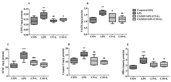 Effect of clozapine (CLOZ) on (A) COX-2, (B) 5-LOX, (C) AChE, (D) Caspase-3, and (E) MDA in LPS-induced rats. The results are expressed by mean ± SEM (n = 6). One-way ANOVA followed by Tukey–Kramer multiple comparisons test. ** p < 0.01 and *** p < 0.001 vs. control group; # p < 0.05, ## p < 0.01, and ### p < 0.001 vs. LPS-induced group.