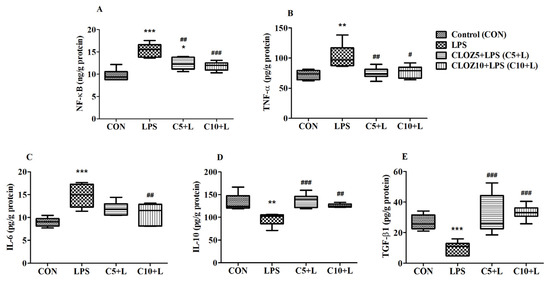 Effect of clozapine (CLOZ) on neuroinflammatory parameters: (A) NF-κB, (B) TNF-α, (C) IL-6, (D) IL-10, and (E) TGF-β1 in LPS-induced rats. The results are expressed by mean ± SEM (n = 6). One-way ANOVA followed by Tukey–Kramer multiple comparisons test. * p < 0.05, ** p < 0.01, and *** p < 0.001 vs. control group; # p < 0.05, ## p < 0.01, and ### p < 0.001 vs. LPS-induced group.