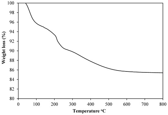 Thermal gravimetric analysis (TGA) was used to investigate the thermal stability of uncalcined 5%Ni/GDC catalyst in the presence of air (Figure 4). Three distinct mass loss regions were found for the uncalcined sample. In the first step, a weight loss of 6.5% at temperature 100–200 °C attributed to loss of adsorbed water. In the second step, a weight loss of 3.2% at 200–300 °C was due to the decomposition of hydroxides releasing water molecules, and the third weight loss of 4.5% at 300–600 °C was attributed to the loss of residual organic materials in the sample [21].