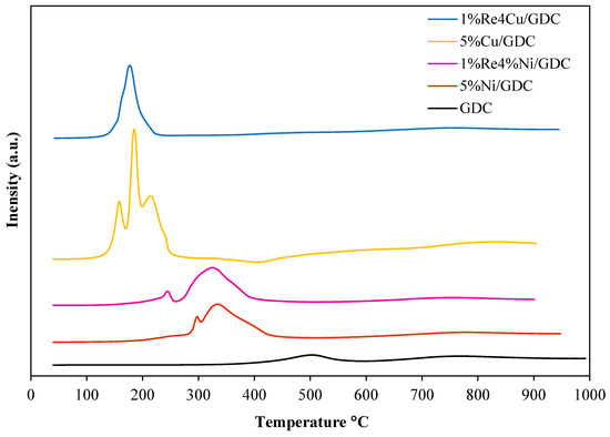 The H2-TPR profiles of supported GDC catalysts are summarized in Figure 5. The H2-TPR profile of the 5%Ni/GDC catalyst displayed two reduction peaks. The first reduction peak was located at 300 °C, which corresponded to the reduction of small crystallite NiO, and the second peak at 340 °C corresponded to the reduction of larger crystallite NiO [22,23]. For 1%Re-4%Ni/GDC catalyst, the reduction peak was shifted to a lower temperature. In addition, H2-TPR peak areas were an indicator to explain the reducibility of the catalyst; the higher the peak areas indicates the stronger the reducibility of the catalysts. It could be seen that the 1%Re-4%Ni/GDC catalyst illustrated higher TPR peak areas than 5%Ni/GDC catalyst, indicating that the Re addition could improve the catalyst reducibility. For the H2-TPR profile of 5%Cu/GDC catalyst, three reduction peaks were observed at 160 °C, 187 °C and 214 °C, which could be assigned to the reduction of small crystallite copper oxide, reduction of copper oxide interacting with surface ceria, and larger crystallite copper oxide, respectively [24]. The H2-TPR of 1%Re4%Cu/GDC is different from those of monometallic 5%Cu/GDC catalysts. A concurrent reduction of metal oxide species appears at 170 °C. An electron density transfer between Re, Cu, and GDC may occur, resulting in the reduction of the catalyst surface is easier.
