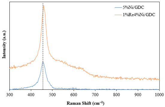 Raman spectroscopy was used to investigate oxygen vacancy in the catalyst. Doping ceria by the substitution of two Ce4+ ions in the CeO2 lattice with Gd3+ results in an O ion being eliminated to conserve the charge. The presence of Ce3+, in which the Ce4+ ions are replaced by Ce3+ ions for oxygen vacancy production, causes the lattice expansion. Oxygen vacancy is related to catalytic performance in many reactions. As can be seen in Figure 6, a Raman peak at around 460 cm−1, characteristic of the symmetrical stretching vibration created by eight O atoms bound to one Ce atom, is observed [25]. Furthermore, a red shift of the F2g peak was observed in 1%Re4%Ni/GDC catalyst due to the increased concentration of Ce3+ in the CeO2-based catalyst. Moreover, other broad peaks in the range of 500–700 cm−1 (denoted as D band) are caused by oxygen vacancies in the catalysts [26]. Comparison between 5%Ni/GDC and 1%Re4%Ni/GDC catalysts indicates that the intensities of the D band were increased after Re addition, suggesting that Re promoted the generation of oxygen vacancies in Ni/GDC catalyst.