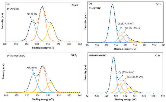 Surface analyses for the Ni and O species present on the catalyst surface were investigated by X-ray photoelectron spectroscopy (XPS). Ni 2p3/2 and O 1s XPS spectra of reduced Ni/GDC and ReNi/GDC catalysts were deconvoluted, as shown in Figure 7. Before XPS measurement, the synthesized catalyst was reduced with 5%H2/N2 at 400 for 1 h. Therefore, nickel was in the metallic state after the reduction. However, the presence of the different Ni species is due to the interaction between Ni and GDC. From Figure 7a, the peak around 853.6–853.8 eV was assigned to Ni0, whereas two peaks at higher binding energy were attributed to the Ni 2p3/2 of NiO [27]. In addition, It was found that the ratio of Ni0/(Ni0 + Ni2+) of 1%Re4%Ni/GDC (33.5%) was higher than that of 5%Ni/GDC (28.2%). Ni0 site is the dominant active site in accelerating the reactants [28]. Therefore, an increase of Ni0 amount in 1%Re4%Ni/GDC implies a superior catalytic activity of Ni catalyst with rhenium addition.