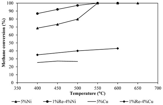 The results of CH4 partial oxidation using a single catalyst (5%Ni/GDC, 1%Re-4%Ni/GDC, 5%Cu/GDC, and 1%Re-4%Cu/GDC) in terms of CH4 and O2 conversion, H2 yield as well as carbon selectivity were illustrated in Table 3 and Figure 8. The experiments were performed on powder catalysts with a weight of 100 mg. It can be seen that the 5%Ni/GDC catalyst showed good catalytic activity in terms of CH4 conversion and H2 yield. The catalytic reaction of the 5%Ni/GDC catalyst occurred at 400 °C and was enhanced with an increase in reaction temperature. The highest performance was achieved at 550 °C with methane conversion and hydrogen yield of 100% and 68.85%, respectively. The results indicate that methane was effectively dissociated to generate C species, which is confirmed by the effluents CO and CO2. Considering 5%Ni/GDC and 1%Re-4%Ni/GDC catalysts, these catalysts showed higher CH4 dissociation activity than Cu catalysts. It strongly indicates that methane dissociation occurs on the metallic Ni active sites. However, a large amount of H2 and CO was detected over 1%Re-4%Ni/GDC catalyst. It suggests that the mobile oxygen species in this catalyst play a very important role in CH4 conversion and CO production. The O2 conversion was found to be 100% for all tests because the produced H2 and CO were reacted with the remaining O2 and converted into CO2 and H2O. Comparing this result with the literature data [23,29], it was found that Ni/GDC catalyst showed higher CH4 conversion than Ni/CeO2 catalyst. The addition of Gd into the CeO2 structure improved the catalytic performance in the partial oxidation of CH4 because its oxygen storage capacity was increased [33]. Furthermore, an increase in methane conversion may occur from H2O and CO2 reforming because H2O and CO2 can be easily dissociated over Ni/GDC catalyst [34,35].