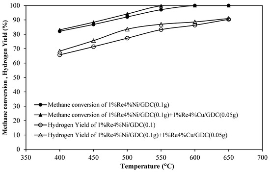 In this section, 100 mg of 1%Re-4%Ni/GDC catalyst was combined with 50 mg of 1%Re-4%Cu/GDC catalyst in the same reactor as shown in Figure 1.