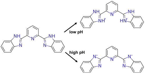 2,6-Bis(2-benzimidazolyl)pyridine (BBP, 98%) was purchased from Macklin Biochemical Co., Ltd. (Shanghai, China). Dimethyl sulfoxide (DMSO), hydrochloric acid (HCl, 1 mol/L), and sodium hydroxide (NaOH, 1 mol/L) were of analytical grade. The BBP stock solution (0.8 mol/L) was prepared by dissolving BBP in DMSO with the assistance of ultrasonication. The fluorescence measurements were performed on an FLS980 steady-state and transient fluorescence spectrometer (Edinburgh Instruments Ltd., Livingston, UK) with an excitation wavelength of 280 nm.