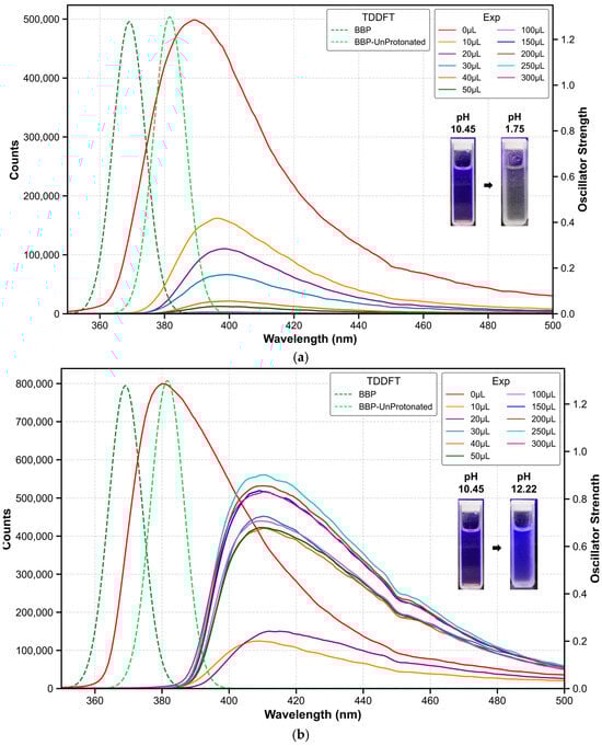 (a) Fluorescence emission spectra of BBP as a function of acid titration volume (0–300 μL), demonstrating pH-dependent spectral changes. The systematic pH decrease from initial 10.45 (0 μL) through intermediate values (9.57 at 10 μL, 3.85 at 20 μL, 3.30 at 30 μL, 3.25 at 40 μL, 3.17 at 50 μL, 2.54 at 100 μL, 2.20 at 150 μL, 2.08 at 200 μL, 1.80 at 250 μL, and finally 1.75 at 300 μL) induces a redshift of the maximum emission from 385 nm to 410 nm, accompanied by significant fluorescence quenching. Experimental data (solid lines) correspond to the left y-axis (counts), while TDDFT calculations (dashed lines) correspond to the right y-axis (oscillator strength). (b) Fluorescence emission spectra of BBP as a function of base titration volume (0–300 μL). The spectra demonstrate pH-dependent changes as the pH increases from the initial 10.45 (0 μL) through successive stages (10.86 at 10 μL, 11.05 at 20 μL, 11.51 at 30 μL, 11.67 at 40 μL, 11.87 at 50 μL, 11.92 at 100 μL, 12.00 at 150 μL, 12.04 at 200 μL, 12.14 at 250 μL, and finally 12.22 at 300 μL), showing an initial redshift of the maximum emission from 385 nm to 420 nm. During titration, the fluorescence first undergoes significant quenching, followed by gradual recovery. Experimental data (solid lines) correspond to the left y-axis (counts), while TDDFT calculations (dashed lines) correspond to the right y-axis (oscillator strength).