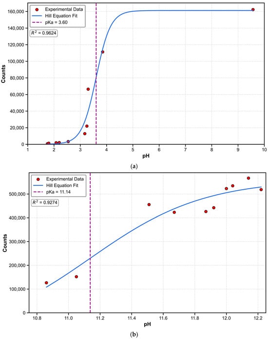 (a) Relationship between fluorescence intensity and corresponding pH for the BBP molecule under acidic conditions. Data points represent experimentally measured fluorescence intensity with corresponding pH values, and the curve represents the fit using the Hill equation, yielding the most basic pKa value of 3.60, with a goodness-of-fit R2 of 0.96. (b) Relationship between fluorescence intensity and corresponding pH for the BBP molecule under basic conditions. Data points represent experimentally measured fluorescence intensity with corresponding pH values, and the curve represents the fit using the Hill equation, yielding the most acidic pKa value of 11.14, with a goodness-of-fit R2 of 0.93.