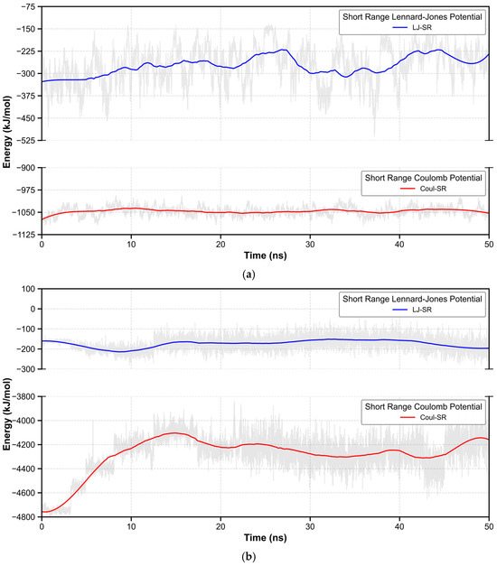 To further investigate the fluorescence quenching phenomenon observed under acidic conditions, we conducted molecular dynamics (MD) simulation studies. Through 50 ns MD simulations of BBP and BBP-Deprotonated in the DMSO solvent environment, we obtained information about the intermolecular interactions. As shown in Figure 4a, for the BBP, the average short-range Coulomb potential (Coul-SR) of intermolecular interactions was −1046.65 kJ/mol (RMSD = 15.59 kJ/mol; Tot drift = 4.38 kJ/mol), and the average short-range Lennard–Jones potential (LJ-SR) was −273.83 kJ/mol (RMSD = 62.82 kJ/mol; Tot drift = 58.79 kJ/mol). In contrast, as shown in Figure 4b, the BBP-Deprotonated system exhibited significantly enhanced intermolecular attractions. Its Coul-SR reached −4280.23 kJ/mol (RMSD = 170.97 kJ/mol; Tot drift = 215.17 kJ/mol), while the LJ-SR was −174.18 kJ/mol (RMSD = 32.68 kJ/mol; Tot drift = 16.84 kJ/mol). This marked difference in electrostatic interactions reveals that the deprotonation of BBP significantly altered the pattern of intermolecular interactions.
