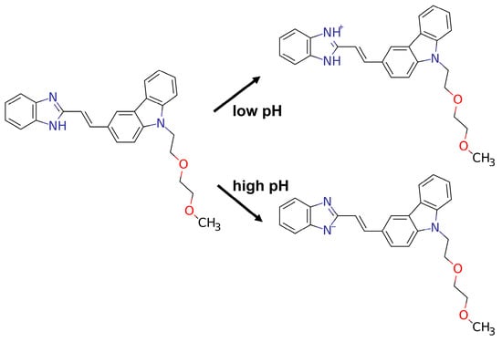 We determined the lowest energy conformation of the BIMC at the PM6-DH+ level. Subsequently, we optimized the ground-state (S0-min) structure using the r2SCAN-3c method, incorporating water as the solvent environment. To ensure that the obtained structure represented a local minimum, we performed frequency calculations to verify the absence of imaginary frequencies. Based on the optimized configuration analysis, we obtained crucial information comprising electrostatic potential (ESP) maps [15,16] and average local ionization energy (ALIE) [17,18], which provided insights into the molecular reactivity. The ESP map serves as an established tool to predict electrophilic and nucleophilic reaction sites, describing the interaction energy between a unit positive charge located at a point and the current system. ALIE characterizes the reactivity of atoms. Figure 5 shows the ESP distribution map. We investigated the reactivity characteristics of the benzimidazole group. The amino nitrogen atom exhibited a high electrostatic potential (+3.077 eV), indicating low electron density and a significant positive charge at this site. This positive charge suggests high affinity for nucleophilic reagents, making it a potential active center for nucleophilic attack. In contrast, the double-bonded nitrogen atom showed a lower electrostatic potential (−2.168 eV), reflecting high electron density and susceptibility to electrophilic attack. Under acidic conditions, this double-bonded nitrogen readily undergoes protonation to form an amino group. The ALIE distribution showed a minimum value of 7.694 eV near the double-bonded nitrogen and a maximum value of 14.025 eV at the amino nitrogen site. Based on theoretical calculations, we elucidated the corresponding behavior of BIMC in acidic and basic environments, as shown in Figure 6. The most basic pKa that was predicted was 6.15 (95% CI: 5.50–6.80), and the most acidic pKa was 12.98 (95% CI: 11.87–14.09). These observations align with chemical intuition and are supported by 1H NMR titration results [10].