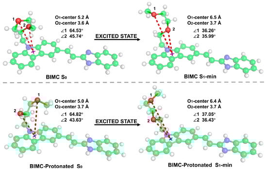 Optimized geometric structures of BIMC (upper panel) and BIMC-Protonated (lower panel) in the ground state (S0) and excited state (S1-min). The red dashed lines indicate the distances from oxygen atoms (O1 and O2) to the imidazole ring center. C: green, N: blue, O: red, and H: white.
