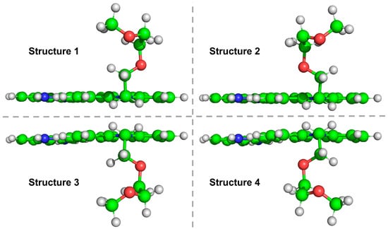 The electronic spectra and excited-state geometries of BIMC and its protonated form (BIMC-Protonated) in acidic environments were investigated using the PBE0 hybrid functional and def2-SV(P) basis set, accompanied by frequency calculations to verify the absence of imaginary frequencies. Figure 7 presents the optimized geometric structures of BIMC/BIMC-Protonated in both the ground state (S0) and excited state (S1-min). Results indicate that while the planar portions of BIMC/BIMC-Protonated showed no significant geometric changes in both S0 and S1-min states, the side chain attached to the imidazole ring underwent substantial conformational extension during the S0-to-S1 transition. Consequently, the two oxygen atoms on the side chain were numbered, and their distances to the imidazole ring center and corresponding angles were marked. In the S0 state of BIMC, the distances from O1 and O2 to the imidazole ring center were 5.2 Å and 3.6 Å, respectively, with corresponding angles of 64.53° and 45.74°. In the S1 state, these distances changed to 6.5 Å and 3.7 Å, with angles of 36.26° and 35.99°, respectively. For BIMC-Protonated in the S0 state, the distances from O1 and O2 to the imidazole ring center were 5.0 Å and 3.7 Å, with angles of 64.82° and 43.63°. In the S1 state, these distances became 6.4 Å and 3.7 Å, with angles of 37.05° and 36.43°. The similarities in angles and key atomic distances between BIMC and BIMC-Protonated suggest that during this energy minimization process, the side chains of BIMC/BIMC-Protonated may have adopted different conformational isomers in S0 and S1-min states. Based on this observation, additional low-energy geometric conformers were selected for geometric optimization during the conformational search phase. The results, shown in Figure 8, present different conformational isomers of the side chain of BIMC-Protonated in the S1-min state. The conformations of BIMC in the S1-min state were highly similar to those of BIMC-Protonated. These four conformers showed no significant differences in their electronic spectra and energies. It can be concluded that the side chain remained stable during pH regulation and did not induce changes in local electronic structure. The pH-responsive properties of BIMC were found to primarily originate from the protonation/deprotonation of the imidazole ring.