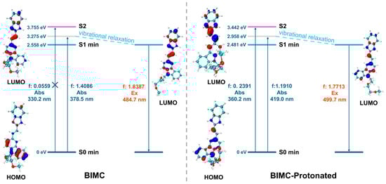 The electronic transition diagrams of BIMC and BIMC-Protonated. C: Cyan, N: blue, O: red, and H: white.