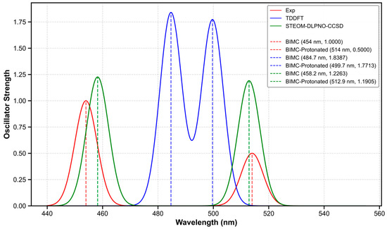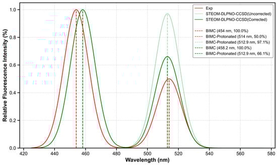 To quantitatively compare the calculated and experimental spectra, electronic spectral calculations for BIMC and BIMC-Protonated were performed using the STEOM-DLPNO-CCSD method with the def2-TZVP basis set [14], based on the S1-min configuration. The spectral data are listed in Table 3. At this level of calculation, the computed fluorescence emission wavelength of BIMC was 458.2 nm with an oscillator strength of 1.2263, while BIMC-Protonated exhibited a computed fluorescence emission wavelength of 512.9 nm with an oscillator strength of 1.1905. At this computational level, the average error rate for fluorescence emission energy was merely 0.57%. These results are illustrated in Figure 10. To enhance the comparability between calculated and experimental spectra, we considered the influence of the fluorescence quantum yield. Under the approximation of neglecting intersystem crossing (ISC) processes, the calculated fluorescence rate for BIMC was Kr1 = 2.94 × 108 s−1 with an internal conversion rate of Kic1 = 4.31 × 107 s−1, while BIMC-Protonated exhibited a fluorescence rate of Kr2 = 2.28 × 108 s−1 with an internal conversion rate of Kic2 = 1.26 × 108 s−1. Subsequently, the calculated fluorescence quantum yields for BIMC and BIMC-Protonated were 87.0% and 64.4%, respectively. The corrected spectral intensities are presented in Table 4. Detailed computational procedures are described in Section 3. As shown in Figure 11, the estimation through fluorescence quantum yield significantly improved the accuracy of spectral calculations.
