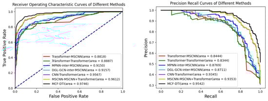 The results presented in Table 2 and Figure 1 indicate that the MCF-DTI model outperforms all other compared models in every evaluated metric, including AUC, AUPR, Precision, Recall, and Accuracy. Specifically, MCF-DTI achieves the highest AUC of 0.9746, which reflects its superior ability to distinguish between interacting and non-interacting drug–target pairs. The AUPR of 0.9542 further demonstrates the model’s effectiveness in maintaining a high balance of precision and recall, particularly in identifying true positives among predicted positive samples. The recall value of 0.9036 highlights MCF-DTI’s strong capacity to identify most of the true interactions, while the precision value of 0.8696 indicates its accuracy in minimizing false positives. In comparison, models such as MSCNN-MSCNN+Transformer (C) and CNN-Transformer perform reasonably well, with AUCs of 0.9612 and 0.9567, respectively, but do not achieve the same level of overall performance. The Transformer-MSCNN and Transformer-Transformer models have relatively lower performance metrics, suggesting that incorporating multi-scale convolutional features, as performed in MCF-DTI, is crucial for effective feature extraction.