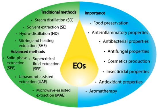 Various extraction approaches have been developed, given the wide range of EO applications and natural sources (Figure 1) [24]. The techniques and coadjuvants employed during the extraction process significantly influence the characteristics, components, and quantity of the essential oil obtained [25]. Although the traditional methods of steam distillation, dry distillation, or mechanical pressing are well known, new techniques have emerged [26]. For example, the use of solvents for extraction is a relatively modern approach. In this method, the plant material is mixed with a solvent and heated to a moderate temperature. After a specific time, the mixture is filtered, and the filtrate is concentrated through solvent evaporation. Finally, the EO is isolated by adding alcohol and distilling at low temperatures [27]. Solvents in this process can act as disruptive agents for the breakdown of plant cells and as preservatives for fragile volatile compounds that could degrade under the conditions of hydro-distillation or steam distillation, making them a valuable tool in the extraction of EOs [28,29]. Understanding these extraction methods is crucial for elucidating the quality attributes and physicochemical characteristics of the final product.
