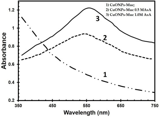 The first important advantage is a significant shortening of the synthesis time of CuONPs-MucAsA in the presence of two reducing agents from 3 days to 4 h. The first indication in the green synthesis of the nanoparticles is the color change in the reaction mixture due to the ongoing reduction processes []. The comparative analysis confirmed that adding AsA at different concentrations (0.5 M and 1.0 M, respectively) affected the formation rate of the biogenic nanoparticles compared to the reaction mixture without AsA.