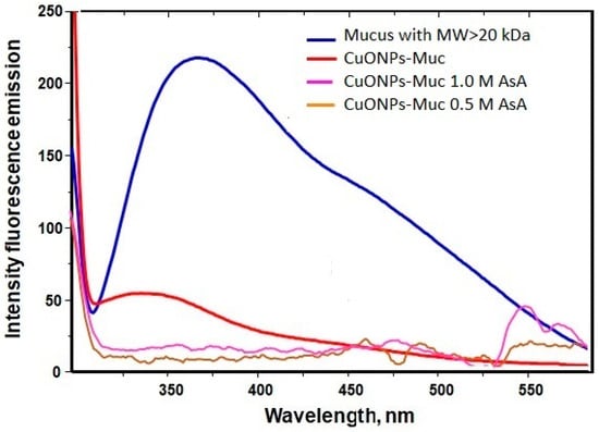 The formation of copper nanoparticles in the presence of AsA was also proven by the results obtained using fluorescence spectroscopy. Interactions of amino acids such as proline (Pro), tryptophan (Trp), or tyrosine (Tyr) with hydrophobic regions in the secondary structures of proteins are known to be involved in the processes of nanoparticle preparation [,]. The observed changes in the emission spectra after excitation at 295 nm of the starting sample—the fraction of mucus with an MW > 20 kDa and after the synthesis of CuONPs-Muc in the presence of AsA—confirm the formation of CuONPs-MucAsA. The emission spectrum of the mucus fraction with an MW > 20 kDa shows a distinct maximum at 360 nm related to the emission of Trps exposed on the surface of the proteins found in the mucus. Recently presented studies show that proteins and glycoproteins, peptides, and amino acids are among the main components of snail mucus that are responsible for the formation of gold and silver nanoparticles [,,].