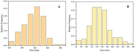 The nanoparticles obtained using the mucus fraction as a reducing agent have a predominant size distribution between 250 and 400 nm (Figure 4A), while the particles formed from the same fraction in the presence of 1.0 M AsA have significantly smaller sizes ranging mainly from 130 to 170 nm, as shown in Figure 4B.