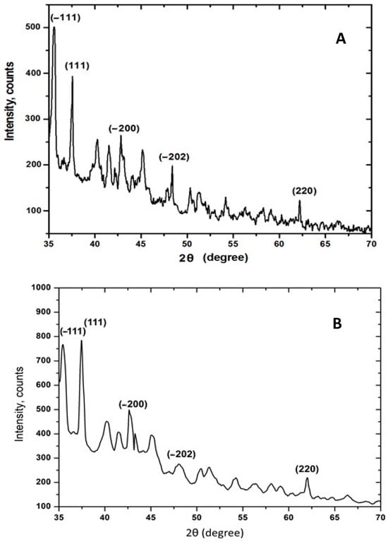 XRD analysis of CuONPs-MucAsA, obtained in the presence of (A) 0.5 M AsA and (B) 1.0 M AsA.