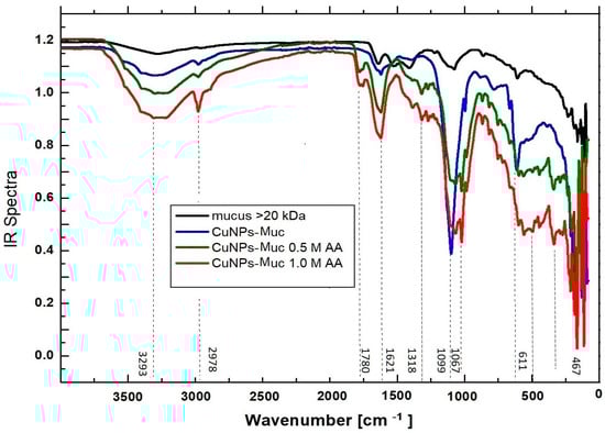 Characterization of the formed CuONPs-Muc without and in the presence of ascorbic acid was carried out by FT-IR. The recorded FT-IR spectra of the native mucus fraction with an MW > 20 kDa and CuSO4.5H2O that synthesized CuONPs-Muc and CuONPs-MucAsA in the presence of 0.5 M and 1.0 M AsA (Figure 7) showed that proteins in the mucus fraction are involved in the synthesis of CuONPs-Muc.