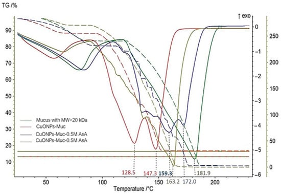 Thermal analyses of the materials CuONPs-Muc, CuONPs-Muc with 0.5 M AsA, and 1.0 M AsA and the mucus fraction with an MW > 20 kDa used to prepare the biogenic nanoparticles were conducted at a heating rate of 10 °K/min in an Ar atmosphere, with a flow rate of 30mL/min, at a temperature of 25 °C–300 °C, and a sample mass of 30–50 mg. Al cuvettes were used. The thermal behavior of a pure mucus sample was compared with the thermal behavior of the composites (CuONPs). Running phase transitions in these samples during heating to 300 °C were also studied.