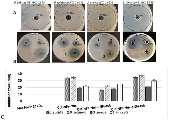 Antimicrobial effect against Gram+ bacterial strains of (A) mucus fraction from C. aspersum with MW > 20 kDa; (B) CuONPs synthesized with reducing agents (1) CuONPs-Muc, (2) CuONPs-Muc 0.5 M AsA, and (3) CuONPs-Muc 1.0 M AsA; (C) Comparative analysis between inhibitory zones of mucus fraction from C. aspersum with MW > 20 kDa and different synthesized CuONPs against Gram+ test bacterial strains.