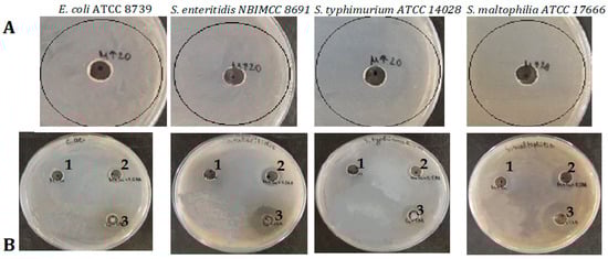 Eight bacterial strains (four Gram-positive and four Gram-negative) obtained from the American Type Culture Collection (ATSC, Manassas, VA, USA) and the National Bank for Industrial Microorganisms and Cell Cultures (NBIMCC, Sofia, Bulgaria) were used in the current investigation (Table 5). The growth of the tested microbial strains was performed at 37 °C for 24 h in standard mesopeptone agar (MPA) with the following composition (g/L): peptone—5, HM peptone B (beef extract)—1, yeast extract—2, sodium chloride—5, and agar—22. Final pH = 7.4 ± 0.2.