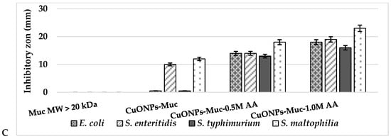 Analyses of the antimicrobial activity of the tested CuONPs on the growth of Gram− bacterial strains showed a different trend. In general, the effect of the synthesized nanoparticles was significantly weaker against Gram− bacterial strains compared to the tested Gram+ bacterial cultures. Furthermore, the most effective in inhibiting the microbial growth of Gram− strains was the CuONPs synthesized with the addition of the reducing agent AsA, with the zone of inhibition varying between 16 and 23 mm. At the same time, the obtained CuONPs-Muc from mucus alone had practically no effect against E. coli and S. typhimurim and was very weak against S. enteritidis and S. maltophilia (10–12 mm) (Figure 10B,C).